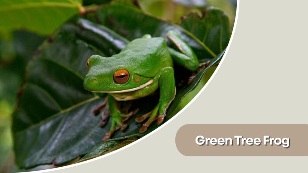 The green tree frog is a bright and lively species commonly found in the southeastern United States. It is known for its smooth green skin and distinctive call, often heard near water at night.